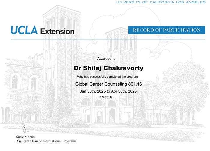 Dr. Shilaj Chakravorty’s journey into career counselling was inspired by witnessing the struggles of students and peers in choosing the right path. Growing up in various Indian cities and engaging with diverse communities, he developed a deep understanding of the social and psychological factors that influence career decisions. His personal interests in music, sports, writing, and cinema make his mentoring style relatable and well-rounded.